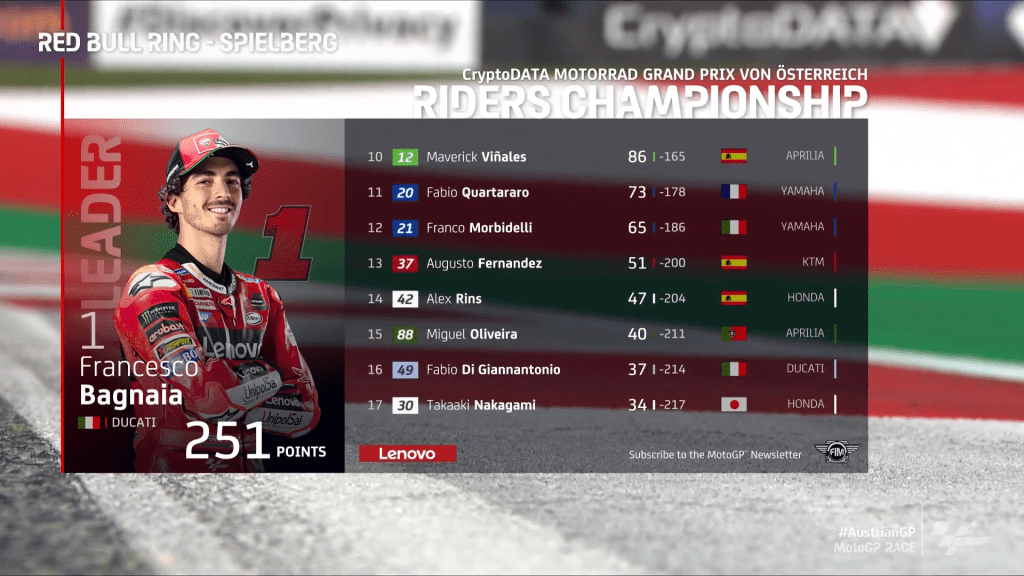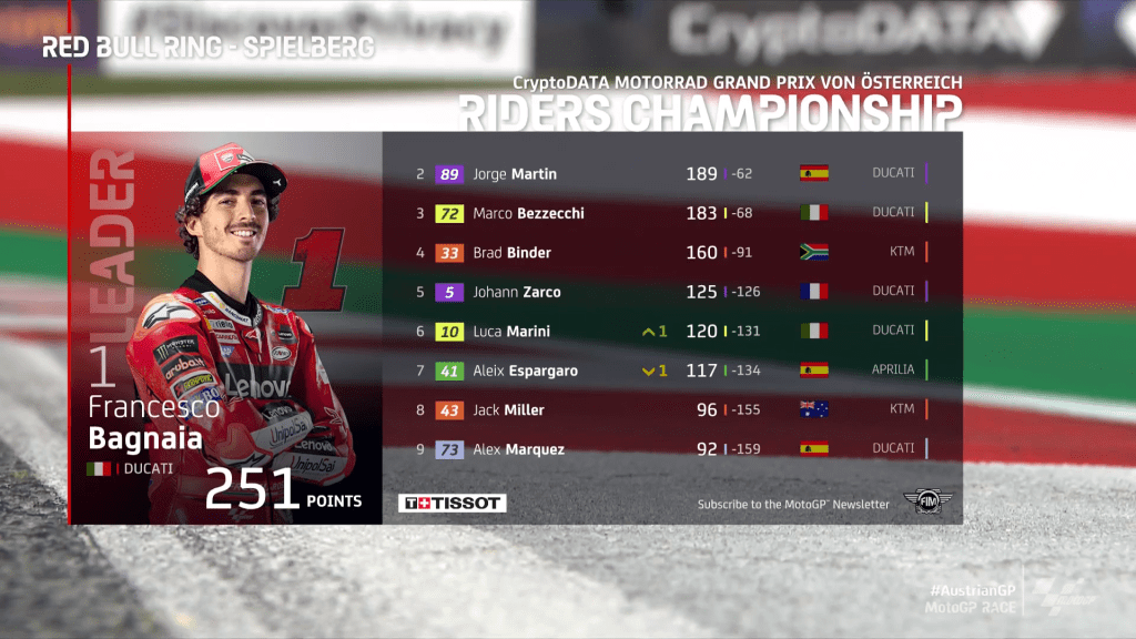 Klasemen sementara pasca MotoGP Austria 2023