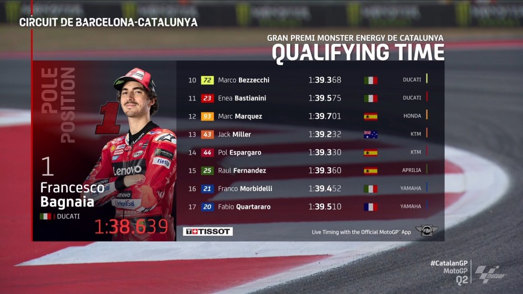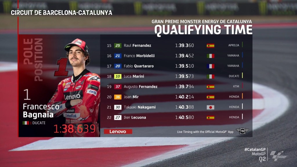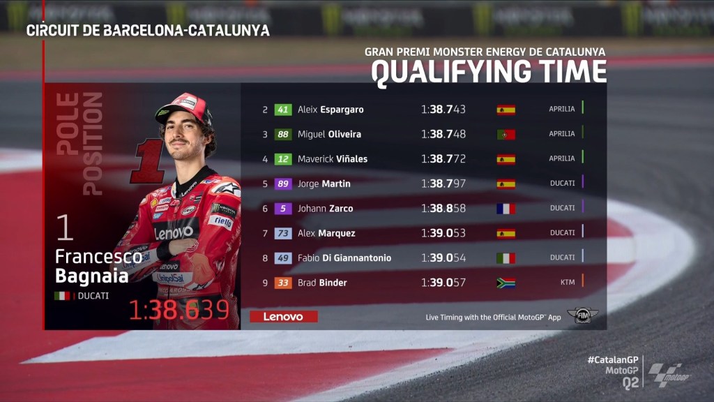 Rider Ducati Lenovo Team sekaligus juara bertahan Pecco Bagnaia berhasil mengamankan pole position di sesi Q2 MotoGP Catalunya 2023 sekaligus mematahkan rekor lap sebelumnya dengan catatan waktu 1:38.6390. Rekor lap time ini menungguli catatan waktu milik Aleix Espargaro musim lalu dengan waktu 1:38:7420.