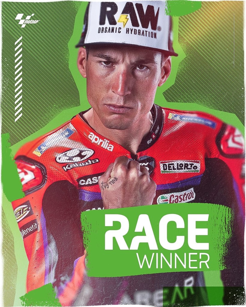 6 lap menjelang finish, Aleix Espargaro melakukan overtaking dan mengambil alih pimpinan balapan dari Maverick Vinales. Dari tangkapan kamera MotoGP terlihat bahwa ban depan keduanya sudah terkikis habis. Hingga bendera finish dikibarkan, Aleix Espargaro berhasil merebut kemenangan kembali setelah meraih juara pada sprint race kemarin. Maverick mengisi di podium kedua diikuti oleh Jorge Martin. Dengan capaian ini, Aprilia mencetak sejarah mereka dengan berhasil finish 1,2 pertama kali dalam keikutsertaan mereka di MotoGP. Kedua pembalap aprilia tersebut merayakan selebrasi dengan unik, dengan bertukar motor satu sama lain. Congrats. Satrio