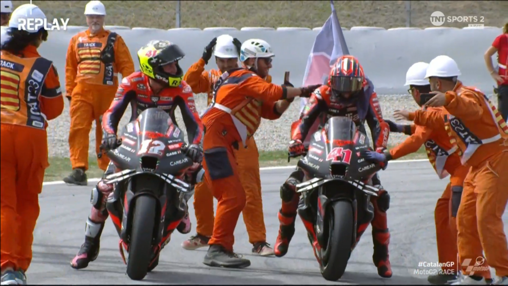 Pecco Bagnaia dipastikan absen pada balapan utama MotoGP Catalunya. Ia harus menjalani pemeriksaan lebih lanjut di medical center pasca high-side di lap pertama. Selepas restart, Maverick Vinales berhasil memanfaatkan start dengan baik dan berhasil memimpin balapan diikuti oleh Jorge Martin, Aleix Espargaro dan Miguel Oliveira. Jack Miller berhasil melakukan start dengan mulus dan berada di posisi keenam pada lap pertama. Pol Espargaro menjadi yang pertama mengakhiri balapan selepas restart, ia mengalami touble di motor RC16 miliknya. Di barisan depan, Aleix Espargaro mengovertake Martin untuk merebut posisi kedua lalu Oliverira juga mengikuti langkah Espargaro untuk mengambil posisi ketiga dari Martin. Brad Binder berhasil naik ke posisi keenam setelah mengovertake Alex Marquez dan Jack Miller namun hal tersebut tidak berlangsung lama, motor KTM RC16nya mengalami masalah sehingga Binder harus menyelesaikan balapan lebih dulu. Balapan kali ini menjadi pertama kali dalam sejarah MotoGP dimana posisi 1,2,dan 3 diisi oleh rider Aprilia.