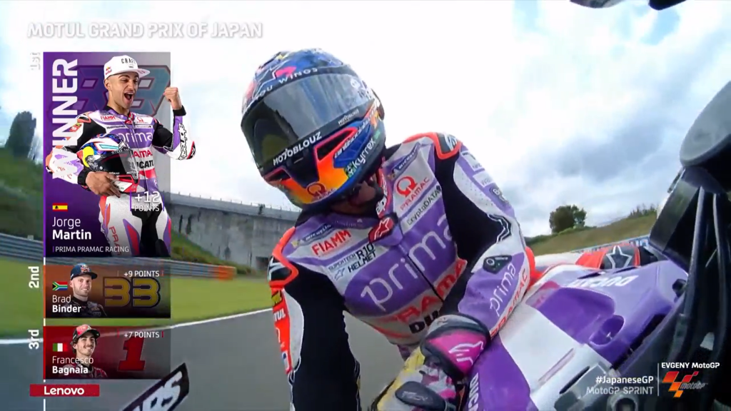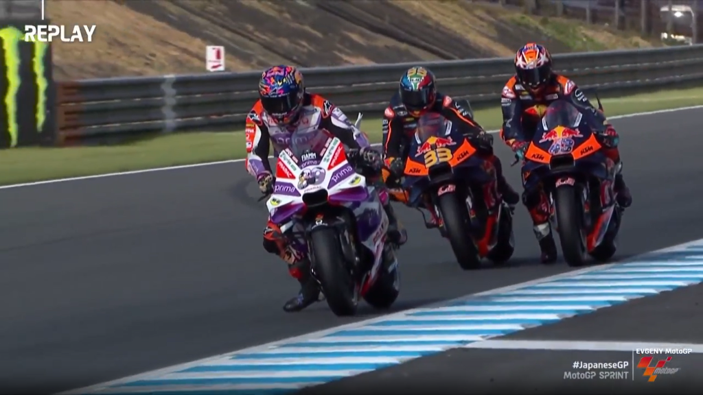 Spaniard, Jorge Martin kembali tampil luar biasa. Ia berhasil memenangi sprint race MotoGP Motegi 2023. Balapan sprint race yang dimulai pada pukul 13.00 WIB ini berlangsung dengan cerah. saat selepas start, Jorge Martin langsung memimpin balapan diikuti oleh Jack Miller dan Brad Binder di posisi kedua dan ketiga. duel sesama pabrikan Eropa antara Ducati dan KTM memang sudah terlihat sejak hari jumat kemarin, keduanya secara bergantian menjadi pencatat waktu tercepat. Sejak seri Motegi ini, pasukan KTM sudah memakai sasis carbon fiber mereka yang terbaru. Sasis baru ini sepertinya memberikan dampak yang signifikan terhadap performa KTM RC16 yang berhasil membawa Dani Pedrosa tampil luar biasa pada MotoGP Misano lalu.