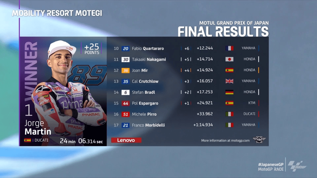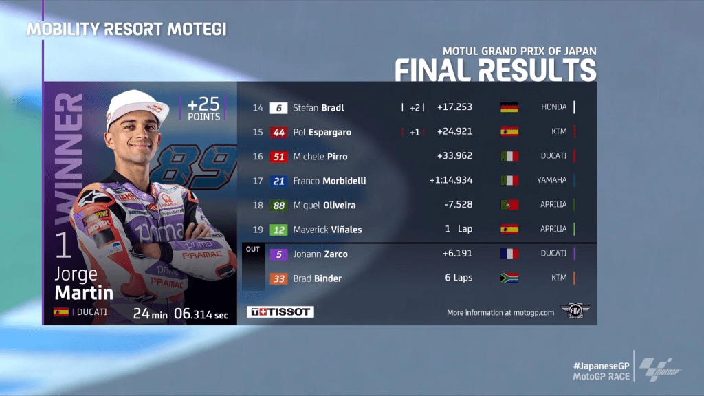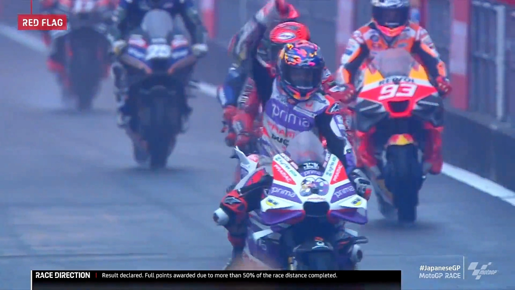 Jalannya race MotoGP Motegi kali ini cukup kompleks dengan diwarnai dengan dua kali red flag. Awan mendung memang menyelimuti sekitaran sirkuit Motegi sejak siang waktu setempat. Sesaat sebelum start, rintik-rintik hujan mulai turun di sekitar sirkuit. Namun, race direction tetap memutuskan untuk melanjutkan start menggunakan ban slick. Selepas start Jorge Martin berhasil memimpin balapan dengan baik. Memasuki tikungan pertama, Insiden terjadi dengan melibatkan Marco Bezzecchi, Maverick Vinales dan Johan Zarco. Bezzecchi yang masuk dari sisi dalam menyenggol Vinales, sehingga membuat pembalap Aprilia Racing tersebut melakukan reflek dengan menghindar ke sebelah kiri, namun naas, Johan Zarco telah berada disisi luar Vinales. Keduanya melebar dan meluncur ke gravel. Vinales crash namun tetap bisa melanjutkan lomba.