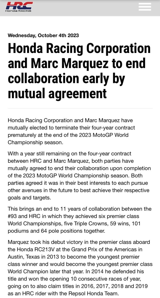 Rumor yang menyatakan bahwa Marquez akan meninggalkan Repsol Honda akhirnya terjadi. Sejak awal musim lalu, juara dunia 8x itu memang santer diisukan akan meninggalkan pasukan HRC. Hal ini ditenggarai ketidakpuasan Marques atas performa motor RC213V. Sejak mengalami cedera parah di awal 2020 lalu, Honda seakan-akan tenggelam tanpa hadirnya sang juara dunia tersebut di garasi.