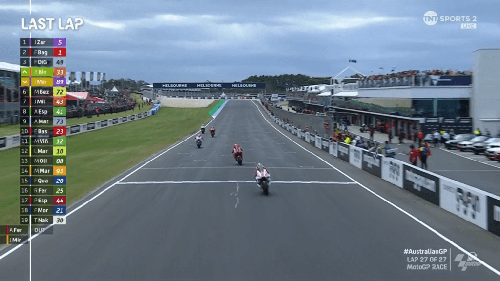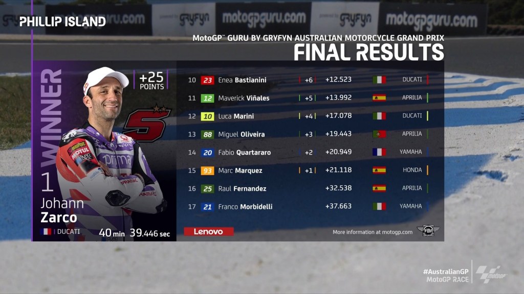 MotoGP Phillip Island berhasil menghadirkan balapan yang begitu menegangkan. Johan Zarco akhirnya berhasil memenagkan balapan MotoGP pertamanya sejak pertama kali menapaki karir MotoGPnya sejak 2017 lalu. Karir MotoGP Zarco di MotoGP sebenarnya cukup baik, sebelumnya ia merupakan rider MotoGP dengan jumlah podium terbanyak yang belum pernah memenangkan balapan di MotoGP. Kemenangan ini memupuskan peluang Jorge Martin untuk kembali menapaki tangga podium tertinggi di MotoGP yang sempat memimpin di sepanjang balapan.
