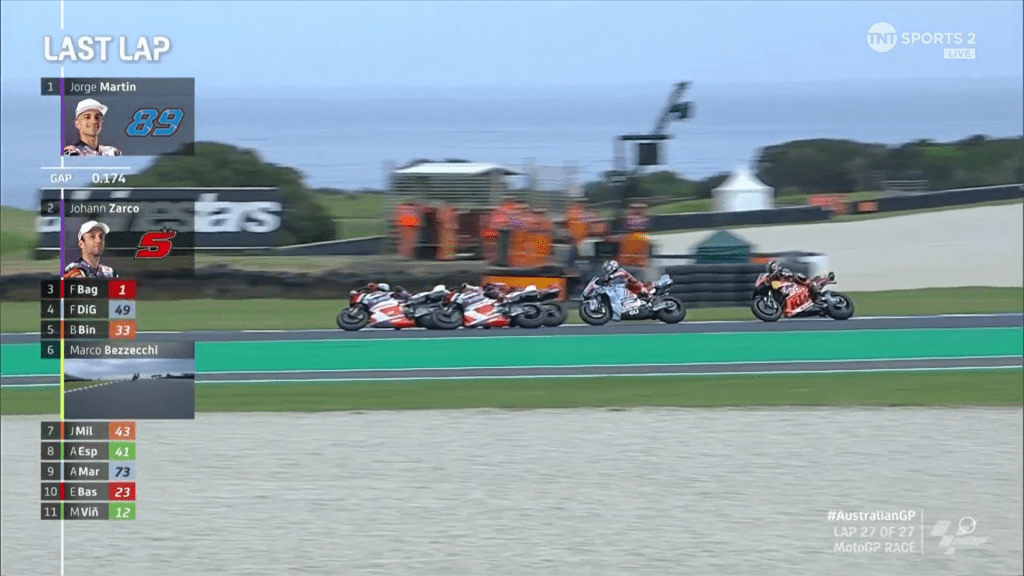Beberapa lap menjelang akhir balapan, DIggia berhasil mengovertake Binder untuk duduk di posisi kedua, diikuti Zarco dan Pecco. Persaingan memperebutkan posisi kedua begitu ketat. Empat pembalap hanya dipisahkan oleh jarak di bawah satu detik. Jorge Martin yang dipertengahan balapan seperti tidak akan terkejar lagi posisinya, di 3 lap menjelang finish jarak antara Martin dengan Binder di posisi kedua menjadi hanya satu detik saja. Martin yang menggunakan komposisi ban depan-belakang Hard Soft sepertinya sudah kehabisan kompon ban di akhir-akhir balapan. Cuaca yang cukup terik dan Martin yang begitu tampil ngotot sejak awal balapan membuat ban belakangnya semakin cepat tergerus aspal Phillip Island. Johan Zarco berhasil melewati Diggia di posisi ketiga di tiga lap menjelang finish setelah straight sirkuit Phillip Island. Zohan Zarco sepertinya memiliki pace yang lebih baik di banding pembalap lain di rombongan grup kedua kemudian berhasil mengovertaking Brad Binder di dua lap terakhir, ini membuat posisi Binder turun ke urutan kelima setelah sedikit melebar ke sisi luar tikungan hingga disusul oleh Diggia dan Pecco. di lap terakhir, Jarak antara MArtin dan rombongan hanya terpisah 0,3 detik saja. Martin sepertinya sudah tidak bisa lagi memaksakan kondisi ban belakangnya. Di sektor kedua putaran terakhir, Zarco mengovertake Martin diikuti oleh Bagnaia yang ikut melihat celah yang terbuka di belakang Zarco. Martin yang sudah tidak mempunyai daya cengkram lagi berturut-turut diovertake oleh Diggia dan Binder di tikungan terakhir.