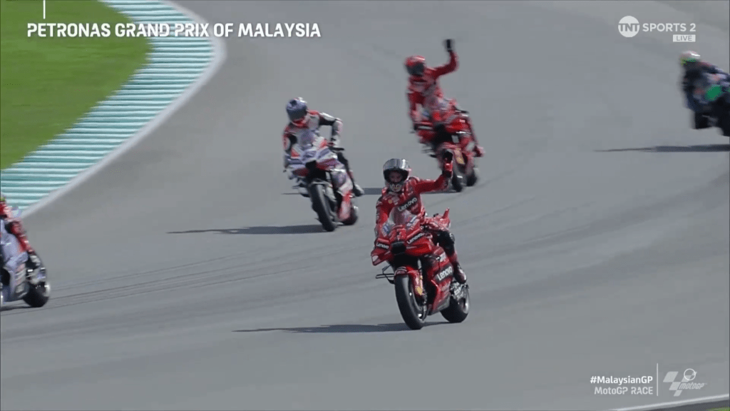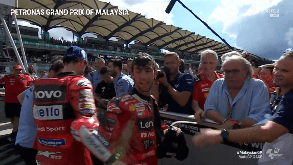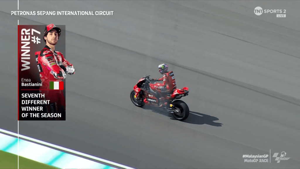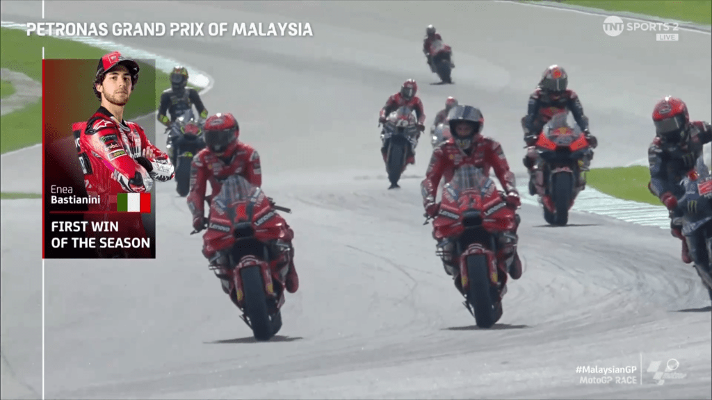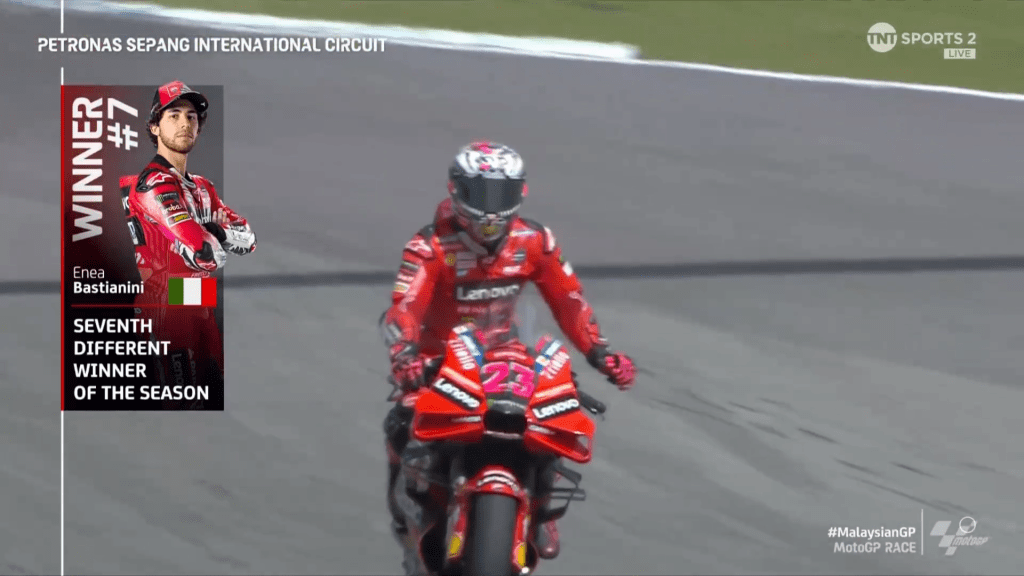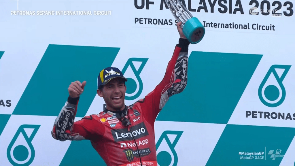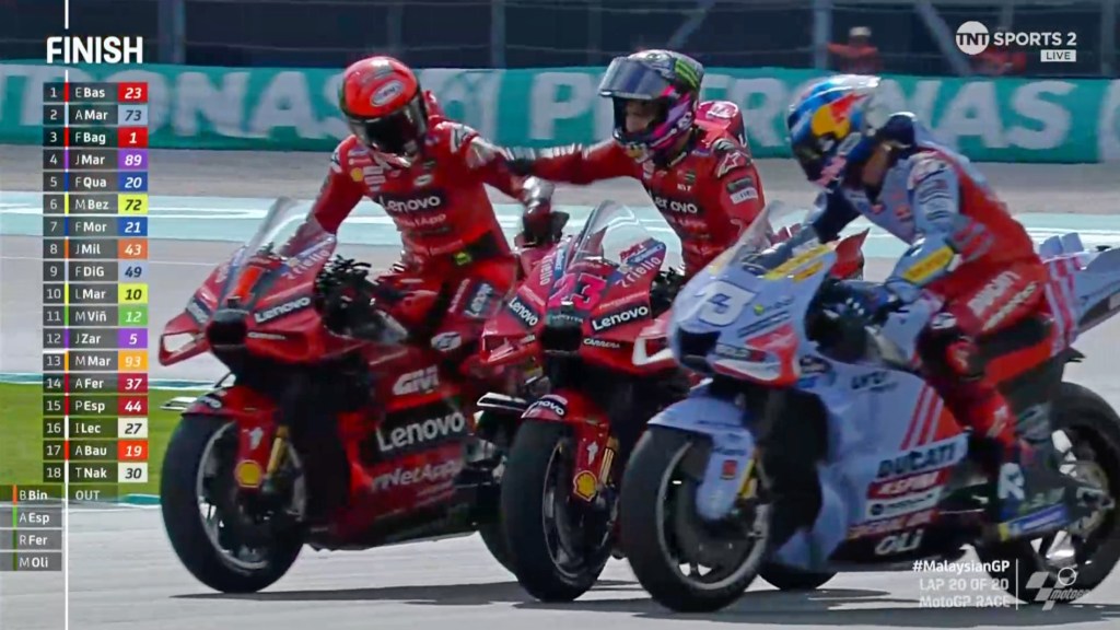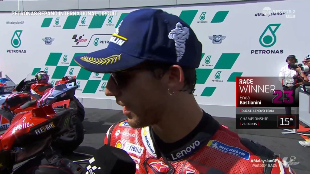 Rider Ducati Lenovo Team, Ena Bastianini berhasil menjadi yang terdepan dalam balapan MotoGP Sepang, Malaysia 2023. Kemenangan ini menjadi kemenangan pertama Bestia tahun ini setelah berkutat dengan cedera sejak awal tahun lalu. Perjalanan Bestia musim ini memang tidak mudah. setelah menjadi penantang gelar juara dunia pada musim lalu, performa Bestia seolah-olah tenggelam musim ini. Ia mengalami cedera yang berkepanjangan sejak seri pertama MotoGP 2023 dimulai dengan mengalami patah tulang selangka di seri Portugal awal musim ini. Bestia membuktikan bahwa ia belum bahis setelah banyak rumor yang beredar bahwa kursinya di Ducati Lenovo Team musim depan terancam jika Jorge Martin berhasil menjadi juara dunia MotoGP musim 2023 ini. Posisi kedua diisi oleh Alex Marquez, rider Gresini Ducati itu tampil brilian dengan berhasil menjuarai sprint race sabtu kemarin dan posisi runner-up pada balapan utama. serta Pecco bagnaian melengkapi podium hari ini di pisisi ketiga. Podium ini menjadi penting bagi Bagnaian dalam perebutan gelar juara dunia dengan Jorge Martin. Dengan podium ketiga ini, jarak poin antara Bagnaia dan Martin saat ini bertambah menjadi dengan selisih 14 poin. Sementara Jorge Martin sendiri harus puas finish di posisi keempat.