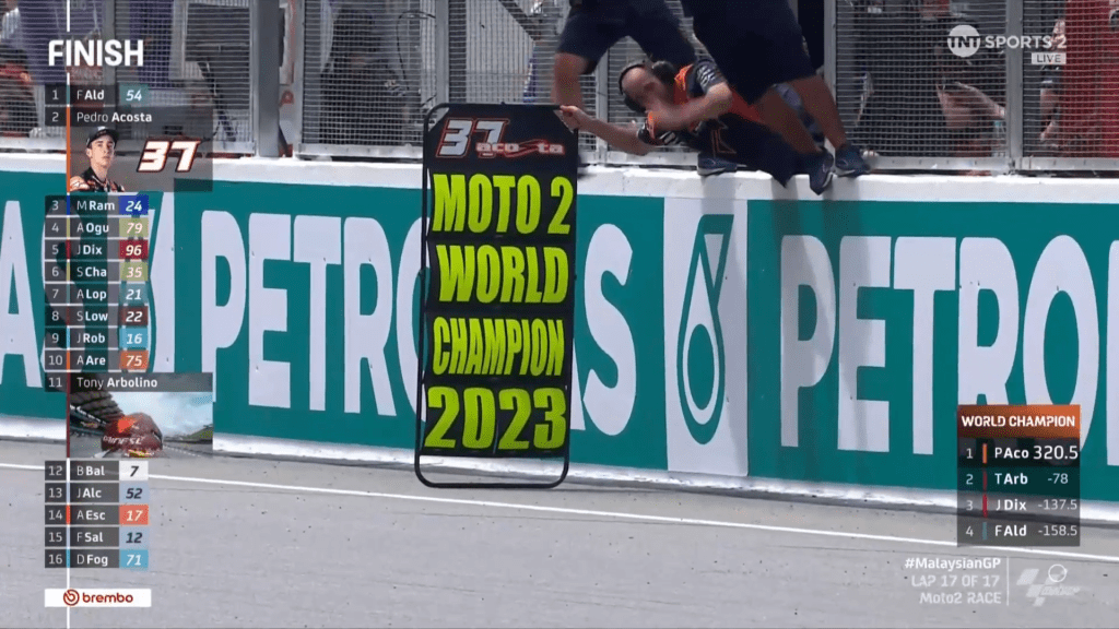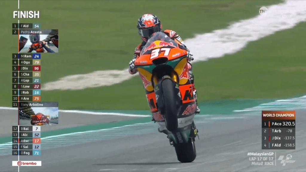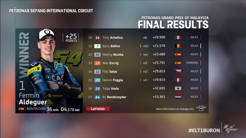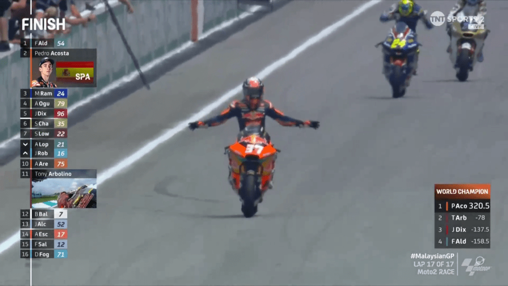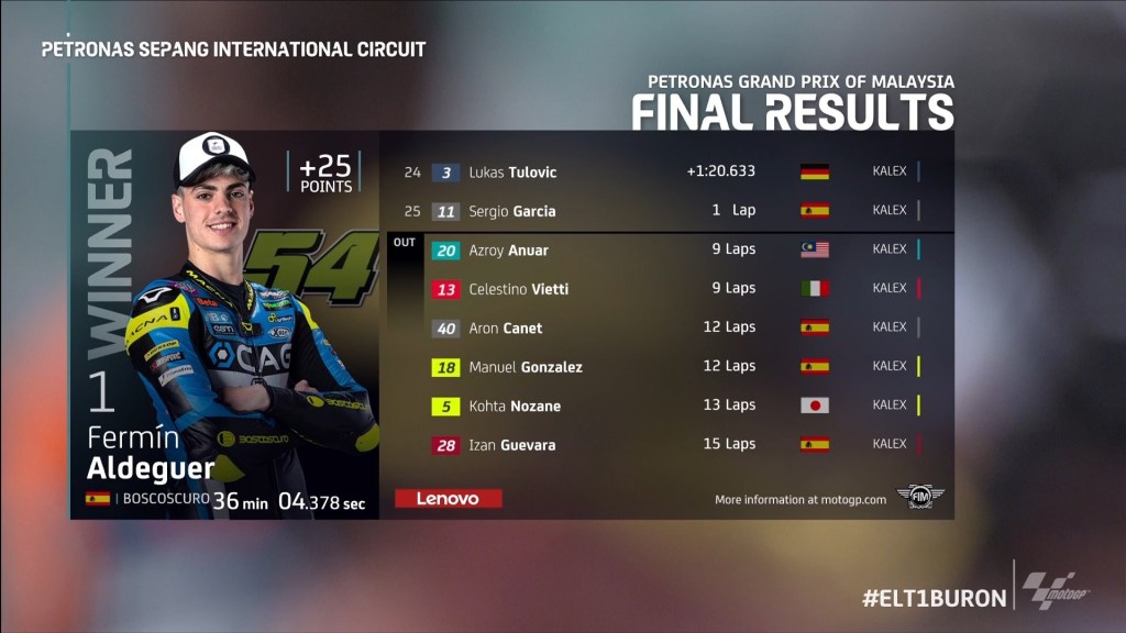 Gelaran Moto2 pada MotoGP Malaysia 2023 menjadi saksi keperkasaan Fermin Aldeguer. Fermin ALdeguer melanjutkan catatan apiknya setelah juara pada Moto2 Thailand akhir Oktober lalu, dengan berhasil menyapu bersih pole position dengan selisih 0,5 detik dari posisi start kedua sekaligus menjadi jawara pada balapan ahad. Rider speed up racing ini tampil begitu dominan dengan gap lebih 7 detik dari posisi kedua yang ditempati oleh Pedro Acosta.