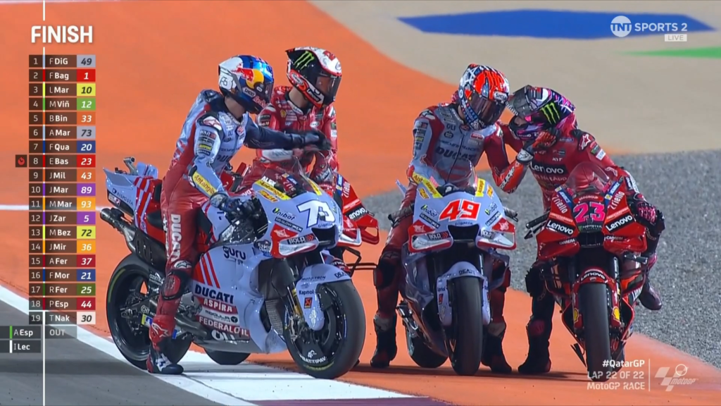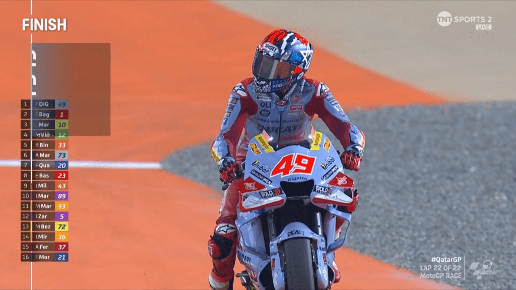 Empat lap menjelang balapan usai, Diggia mendapat clue dari crewnya yang bertuliskan mapping 8 pada dashboard motornya dan kode ‘0000’ pada papan catatan waktunya dari pinggir paddock. Menanggapi hal tersebut, sejak 4 lap terakhir Diggia semakin mendekati Pecco, hingga akhirnya berhasil melakukan overtaking. Diggia berhasil mengambil alih pimpinan balapan dari Pecco. Pecco yang sedang dalam perburuan point dengan Martin berusaha untuk kembali merebut posisi pertama. Pecco kembali mencoba mengovertake Diggia pada tikungan bertama, membuat keduanya hampir saling bersengolan. kesalahan ini membuatnya melebar ke sisiluar tikungan pertama. Hingga garis finish di kibarkan, posisi tidak banyak berubah. Diggia di pisisi pertama, kemudia diikuti oleh Pecco, dan Luca Marini. Dengan hasil ini, penentuan juara dunia akan dilanjutkan di seri pamungkas, Valencia minggu depan. Satrio