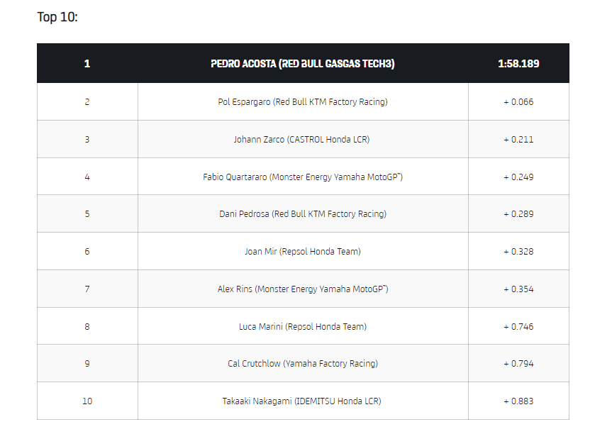 Dari rekapitulasi hasil test yang dilakukan, rider muda sekaligus rookie musim ini, Pedro Acosta berhasil menjadi yang tercepat dalam 3 hari pelaksanaan test ini. Ia berhasil mencacatkan waktu tercepat pada hari ketiga. Secara keseluruhan hasil test ini akan menjadi data awal sebelum dilaksanakannya test resmi MotoGP pada tangga 6-8 Februari ini di sirkuit yang sama.